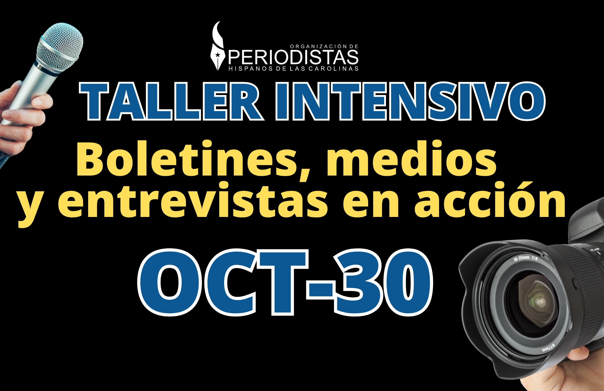 ¡EN ESPAÑOL! Este Jueves 30 de octubre participa en el Taller Intensivo: Boletines, medios y entrevistas en acción relaizado pro la Organización de Periodistas Hispanos de Las Carolinas Aprenderás: Cómo redactar boletines de prensa Estrategias para manejar crisis institucionales Técnicas para dar entrevistas con práctica en vivo